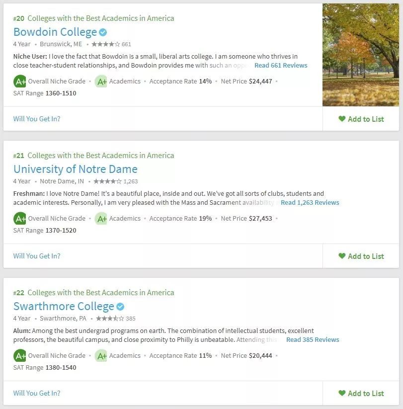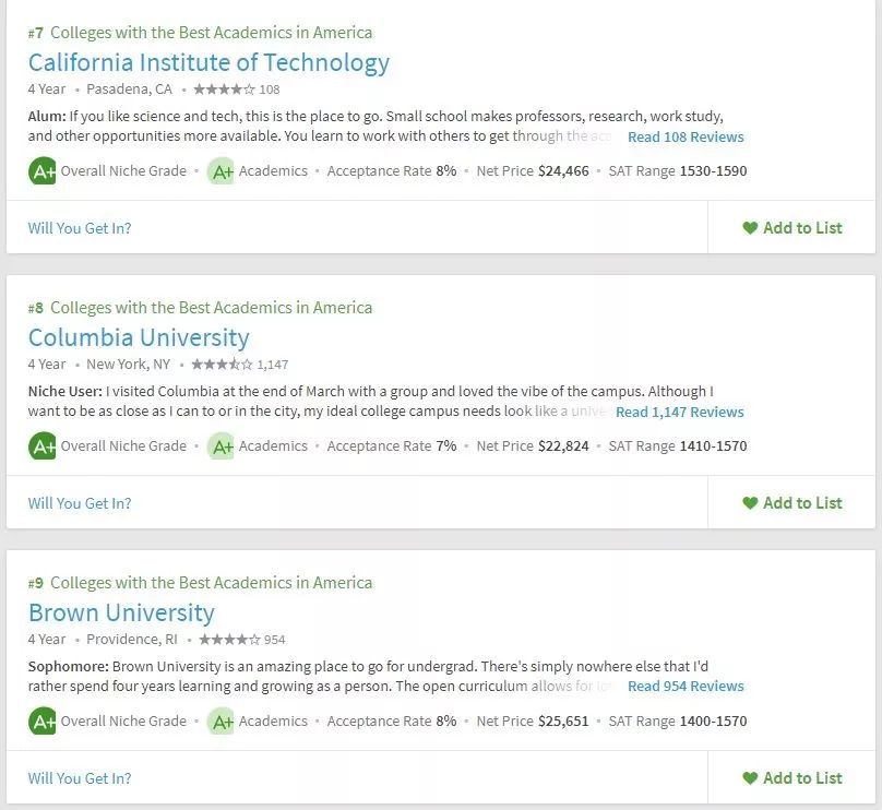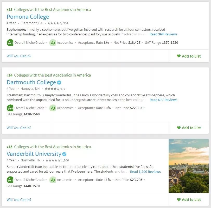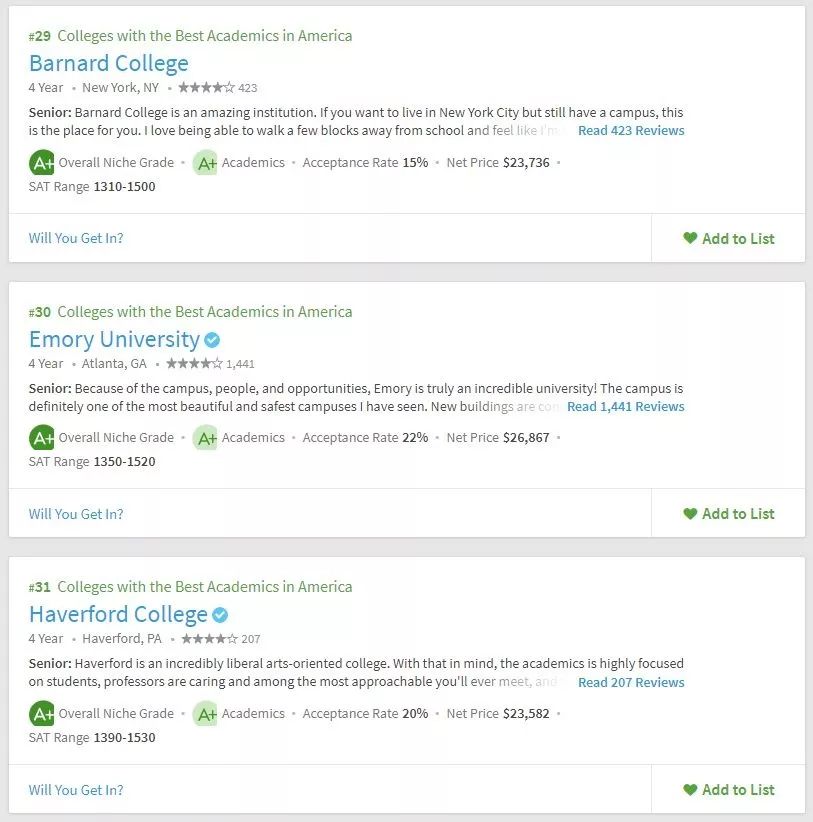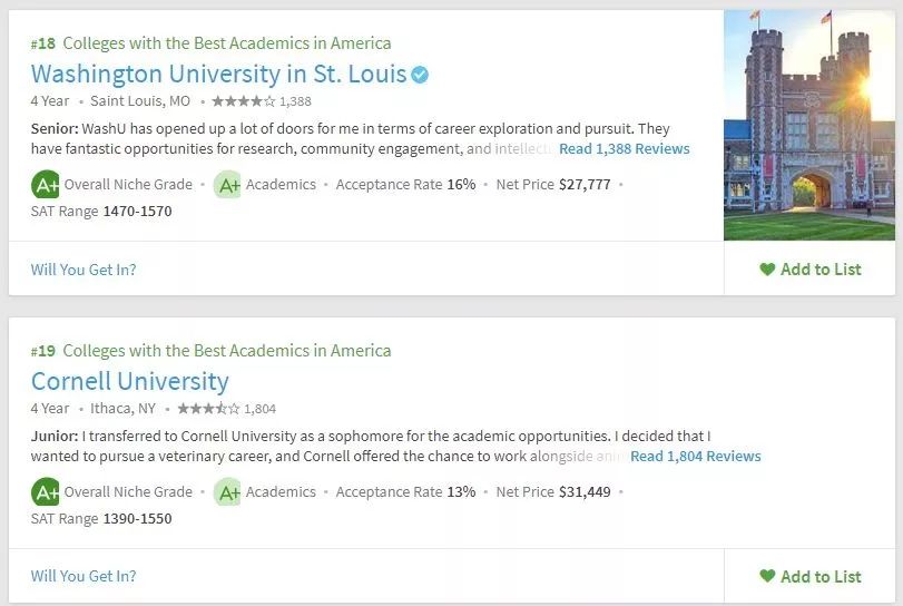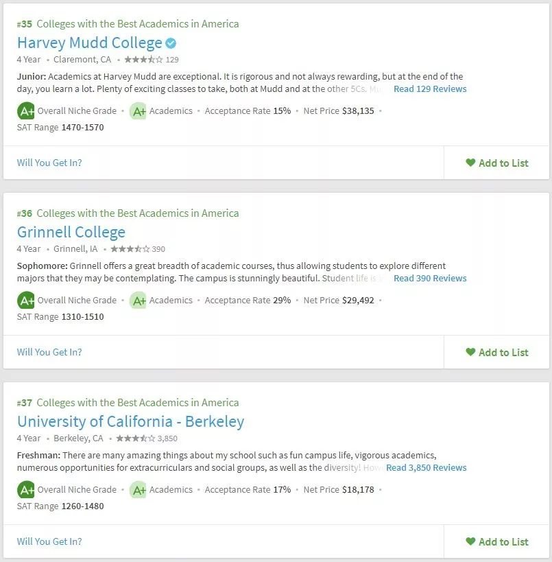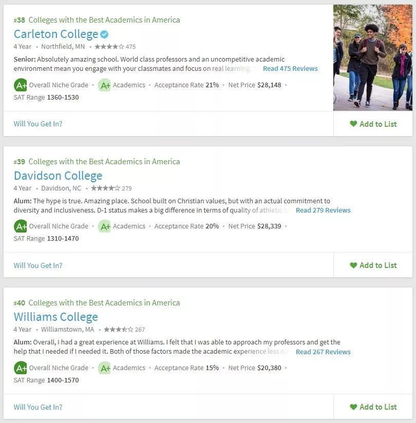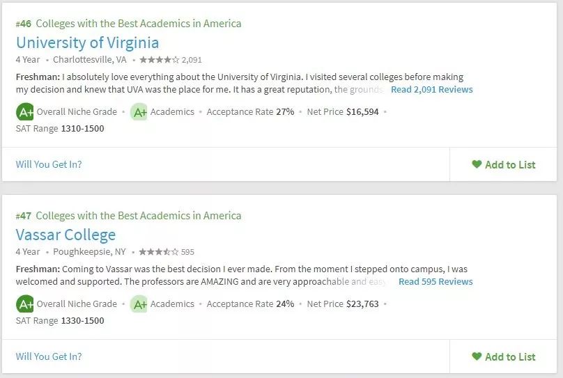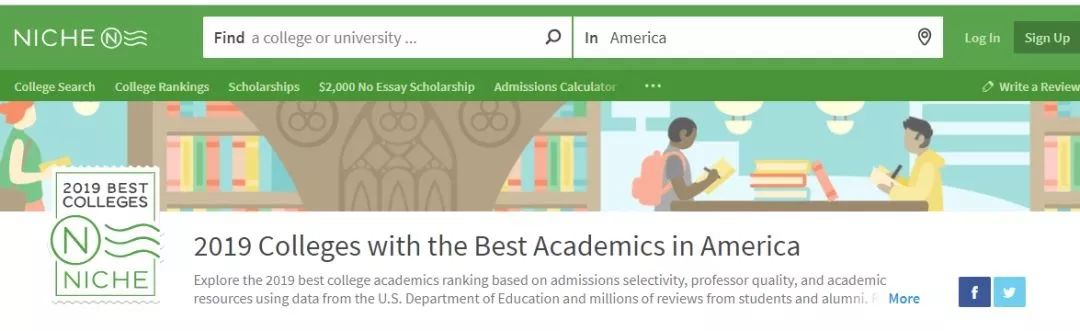 美国留学申请,择校要参考多方面的东西,不能紧盯着US.News,要从多方面去综合衡量院校情况。所以学校的学术氛围你必须得关心吧。Niche在学术方面给出了两个排名,一个是全美最佳学术大学,一个是全美最佳教授大学。