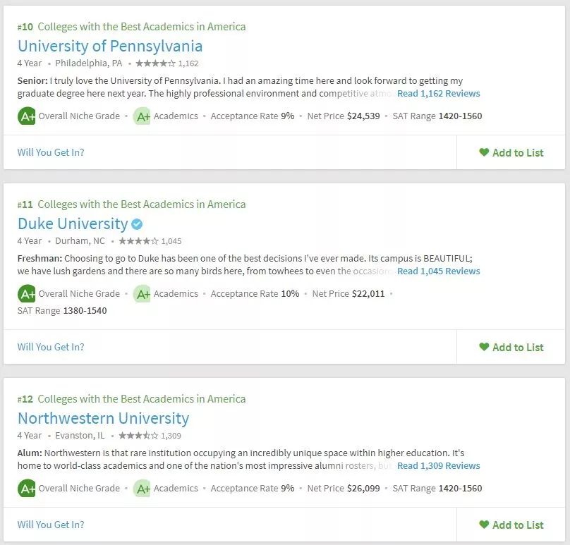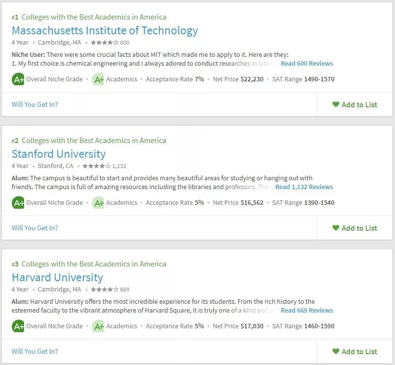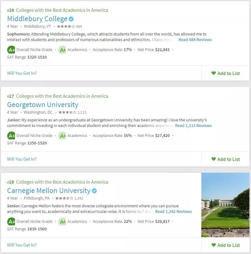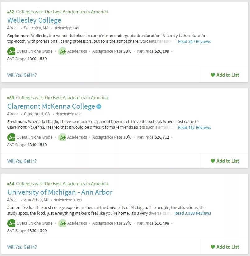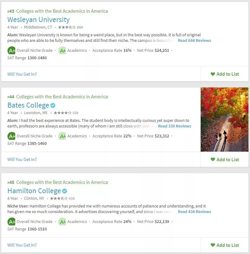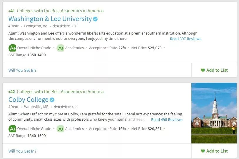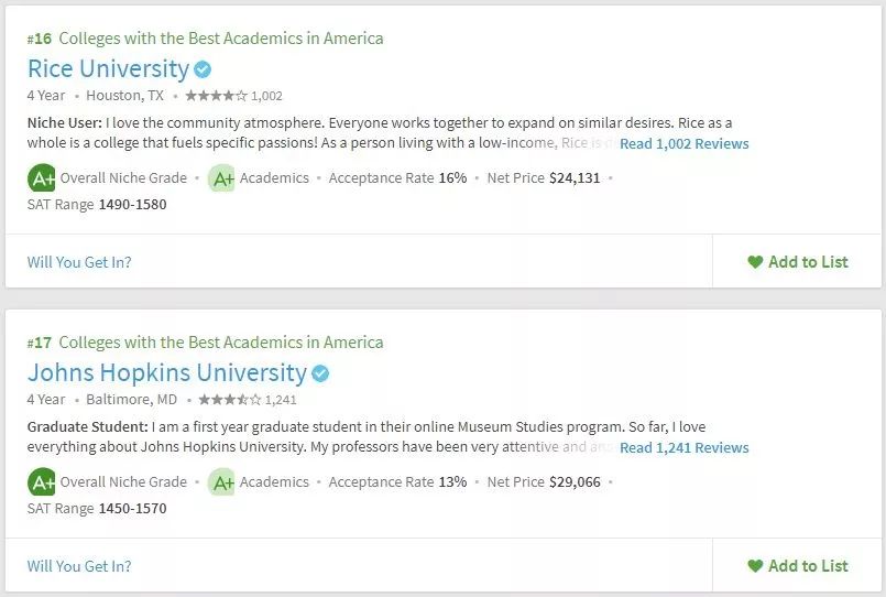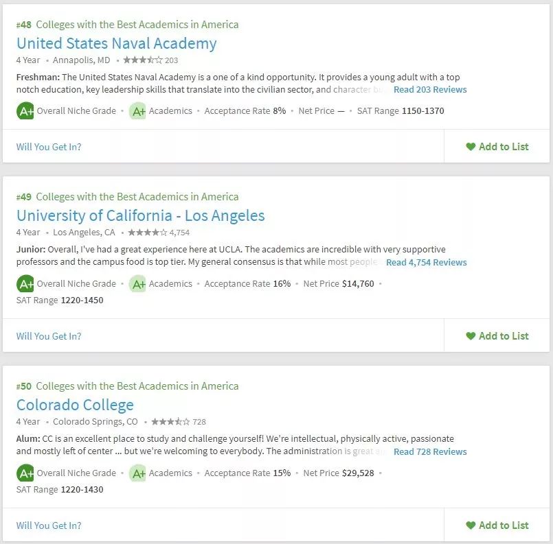 美国留学申请,择校要参考多方面的东西,不能紧盯着US.News,要从多方面去综合衡量院校情况。所以学校的学术氛围你必须得关心吧。Niche在学术方面给出了两个排名,一个是全美最佳学术大学,一个是全美最佳教授大学。