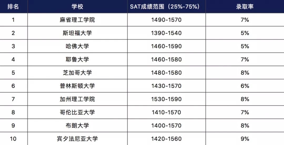 前10名我们都十分熟悉,都是在 美国大学 排名上前列的选手,学术实力当然也是十分顶尖的。从SAT成绩范围和录取率可以看出,想要进入这10所名校,不是那么的容易能进入的都是十分优秀的同学!