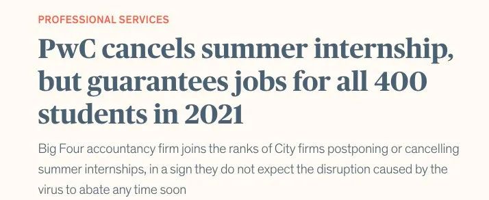 不仅如此,今年四大纷纷宣布取消暑期实习生,微软已取消多场招聘活动并暂时冻结多个岗位,Facebook、Google、Yelp、Airbnb、Cruise Automation、Indeed等多家公司在取消暑期实习的同时,还顺手撤回了已经发出的offer。