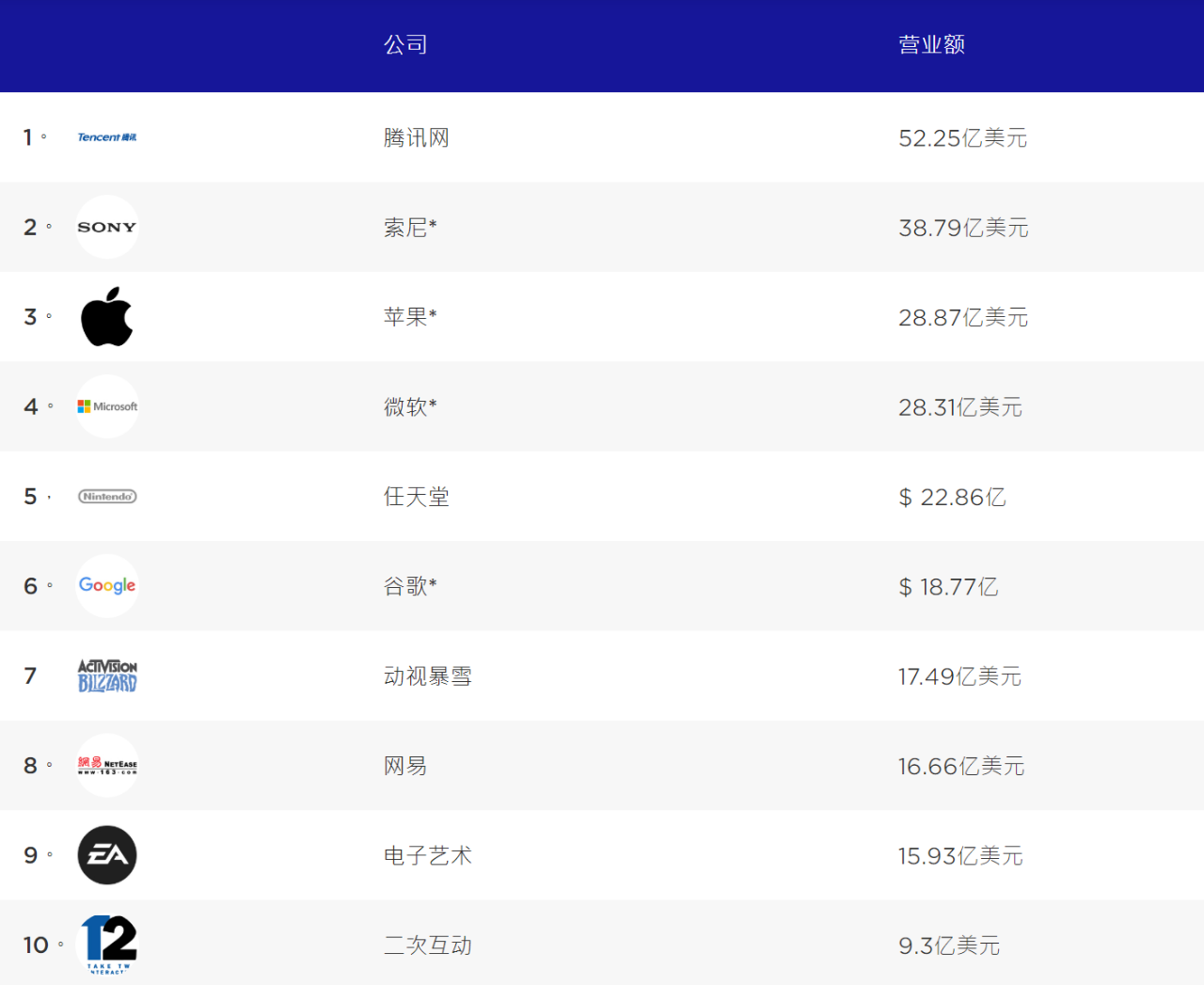 全球前十视频游戏上市公司(资料来源:Newzoo.com 全球游戏公司排名)