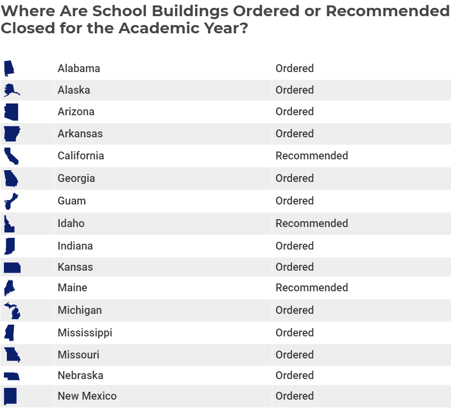 另外,目前全美已有19个州规定全州停课时间延长到本学年的剩余时间,即5月或6月。