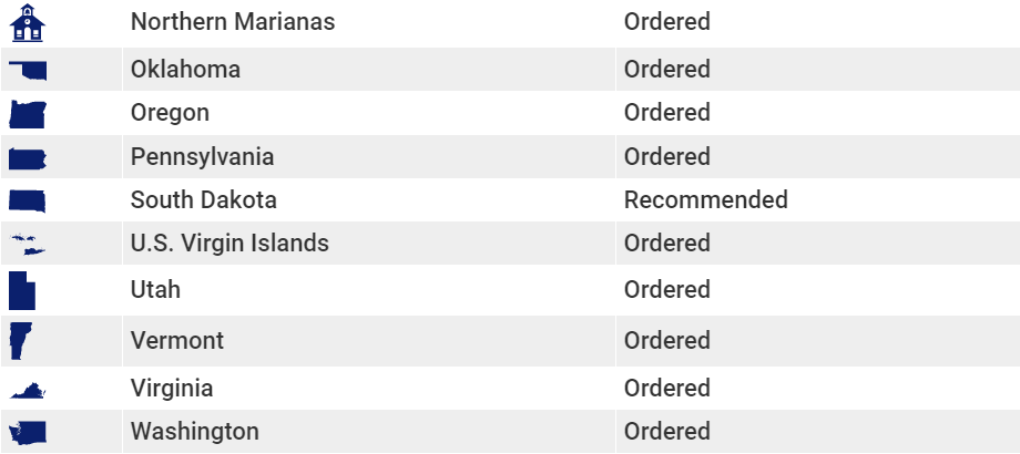 阿拉巴马州、阿拉斯加州、阿肯色州、亚利桑那州、加州、乔治亚州、关岛、爱达荷州、印第安纳州、堪萨斯州、缅因州、密歇根州、密西西比州、密苏里州、内布拉斯加州、新墨西哥州、北马里亚纳、俄克拉何马州、俄勒冈州、宾西法尼亚州、南达科塔州、美属维尔京群岛、犹他州、佛蒙特州、维吉尼亚州、华盛顿州