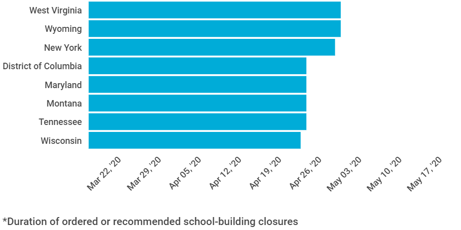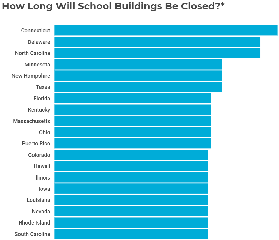 可以看到,关停校园最久的康涅狄格州,一直持续到5月20日。其次是特拉华州和南加州,截止5月15日;明尼苏达州、新罕布什尔州和德州的截止日期均在5月1日。