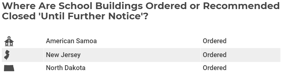而除了以上图标中列出的这些,那些被建议州内关停校园,但没有给出具体开通时间,等待通知的州和地区还包括:美属萨摩亚、新泽西州、北达科他州。