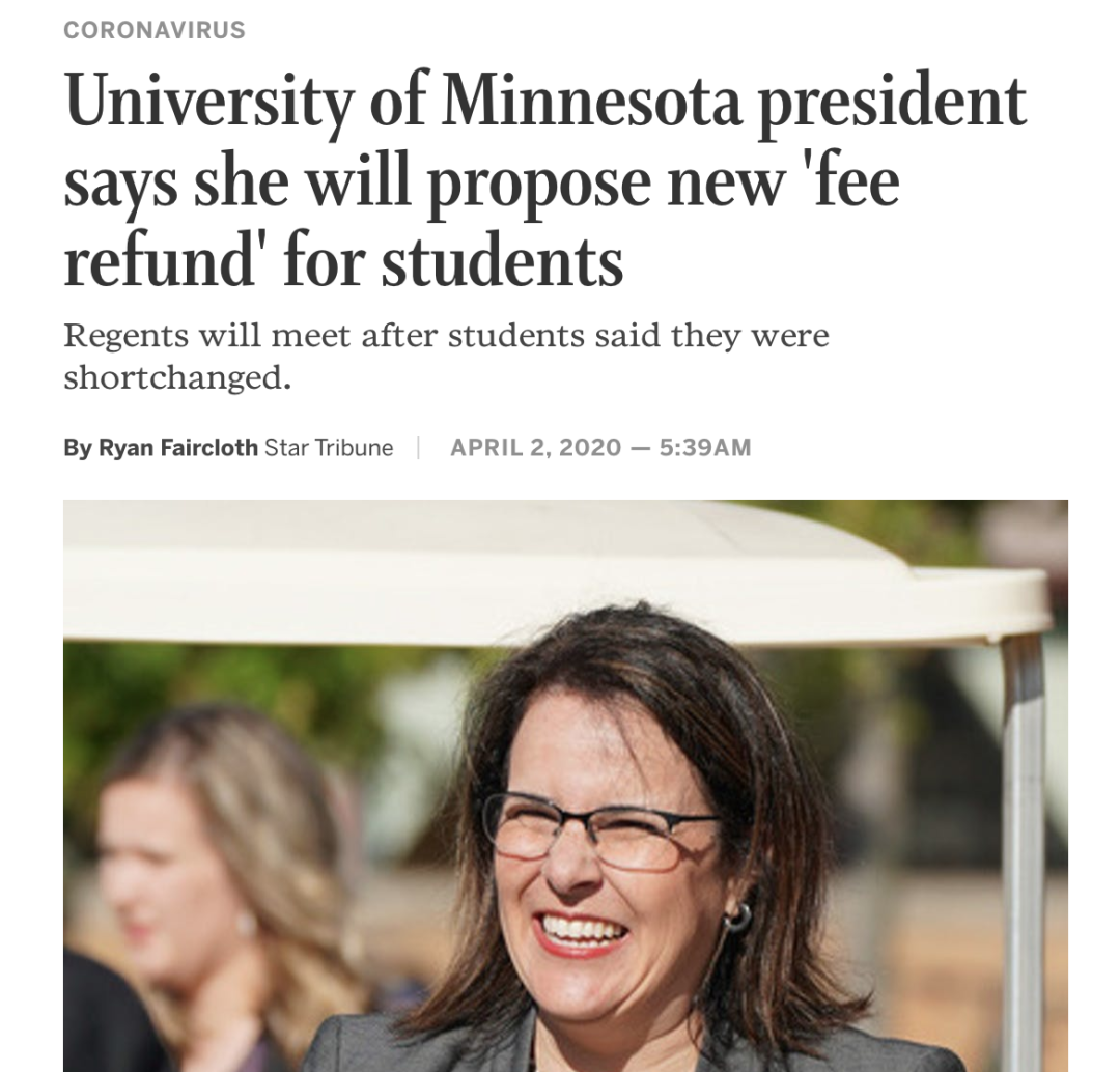 除了“按比例退款”,还有学校选择了“统一退款”(flat payment),就是统一给学生退固定的钱数,明尼苏达大学就是统一向学生退款1200美元。