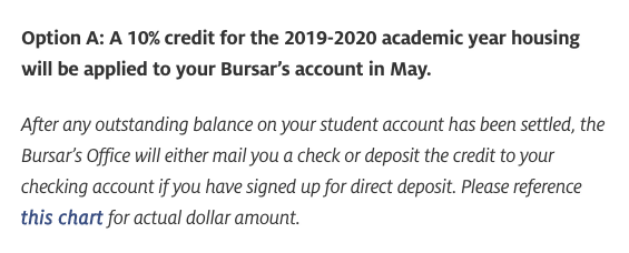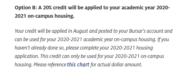 而亚利桑那大学选择了另外的一种形式:租金抵免(rent credit),也就是说学生无法拿到直接退款,而是会变成某些抵扣券之类的东西。