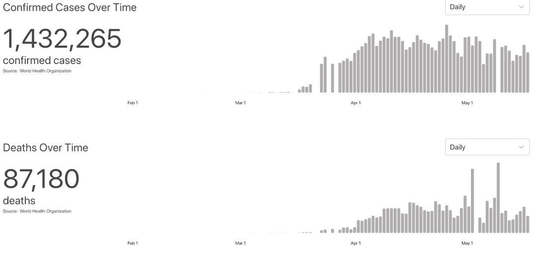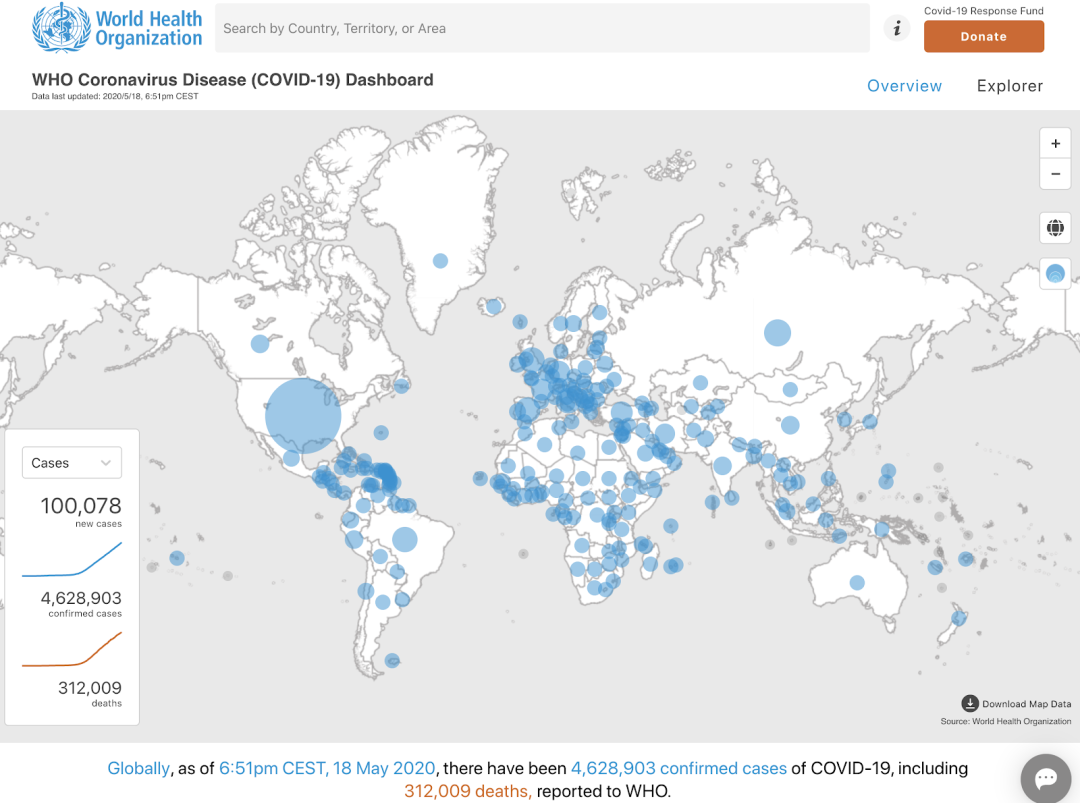 截至2020年5月18日美国东部时间下午7时51分,全球已向世卫组织报告了4,628,903例新冠确诊病例,包括312,009例死亡。