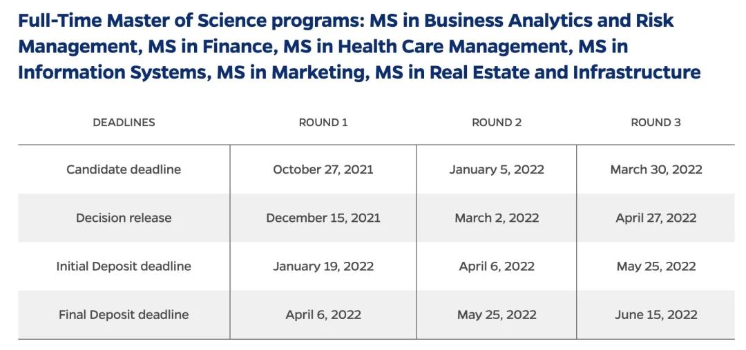 我们可以看到,Round Admission分时间轮次的申请截止日期,从入学季的前一年的十月开始,一直绵延到第二年的四五月份,常见有3-5个轮次。
