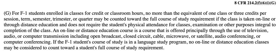 【原文翻译】(G)对于以学分或课堂时间就读的F-1学生,每学期,学期,学期,学期或季度每学期不超过一堂课或三学分的等值学费,如果满足以下条件,则可计入全部课程学习要求:该课程是在线或通过远程教育进行的,不需要学生亲自参加课程,考试或完成课程所必需的其他目的。在线或远程教育课程是主要通过使用电视,音频或计算机传输(包括开放广播,闭路,电缆,微波或卫星,音频会议或计算机会议)进行提供的课程。如果F-1学生的学习课程是语言学习课程,则不应考虑将在线或远程教育课程计入学生的全部学习要求。