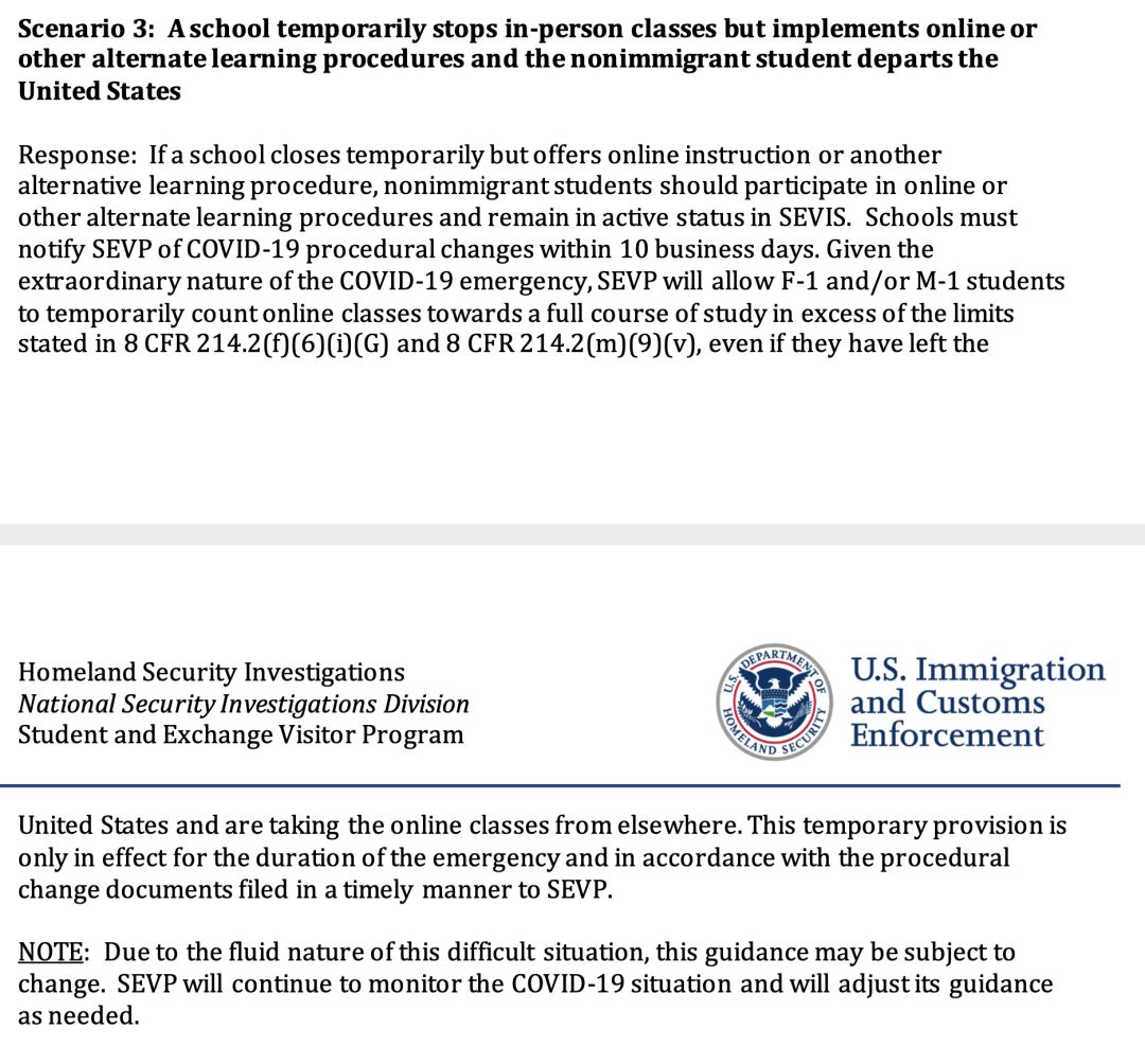 【原文翻译】方案3:一所学校暂时停止亲自上课,但在网上或其他替代学习程序,非移民学生离开美国。