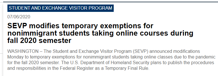 本周移民局接二连三“搞事情”,先是发布了一则政策变动让所有国际生和家长慌了神。大致内容是针对秋季纯线上运营学校的国际生取消身份的问题。但是“纯上网课的学校”到底是指的哪些学校,后面经过专家老师解读发现我们大部分学生所在的正规学生都不在纯线上授课的范围内(《最新!权威!移民局关于2020秋季新规的问答翻译》),所以大家终于稍微放松了一口气。