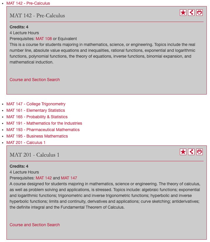 然后是MAT 142 预备微积分,包括指数,对数,反向函数;接着是MAT 201 微积分1,包括极限,微分和曲线。