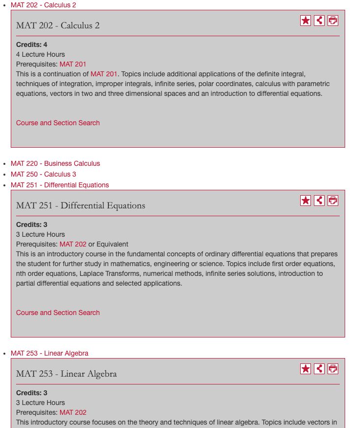 然后是MAT 202, 微积分2,包括无限序列,二维和三维 空间的矢量,微分方程;然后可以修 MAT 251,偏微分方程,包括一次等式,拉普拉斯变换,无限数列,偏微分方程的应用;或者是MAT 253, 线性代数。