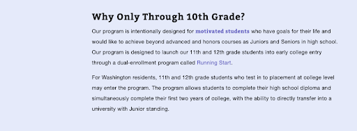 而在华盛顿州,还有一个特别的加速制度——“起跑计划 Running Start”,对国际学生就叫“高中大学联读”。这个项目里的学生不必再有高中学籍,不必去高中上课,只用在社区大学上课。当修到相当数目的大学学分后,可视为已达到高中毕业的水平,完成高中课程,由州里颁发正式的高中毕业证。