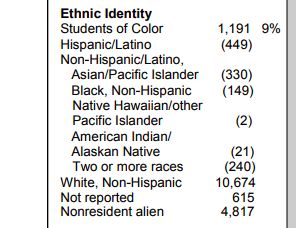 一般来讲,理工科院校的亚裔的比例较高,比如卡耐基梅隆大学。还有一点,院校的种族比例和当地的人口种族比例相关,比如乔治亚大学的非裔比例就高于新罕布什尔大学。新墨西哥州或者德州的院校西班牙裔的比例则会比较高。
