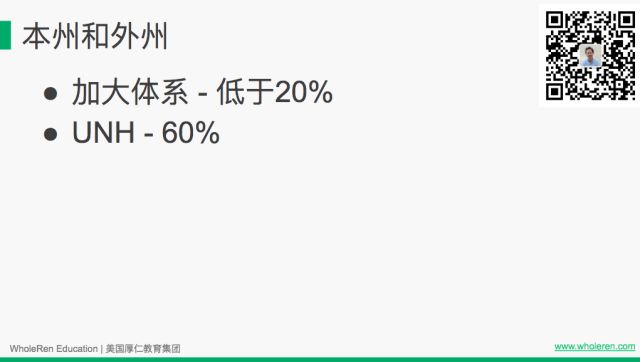 在美国,国际学生的比例为5%,约100万人。有一些院校国际学生比较多,比如纽约大学的国际生比例为19%。有一些院校国际生比例则较低,比如UNH为3%,低于平均比例。