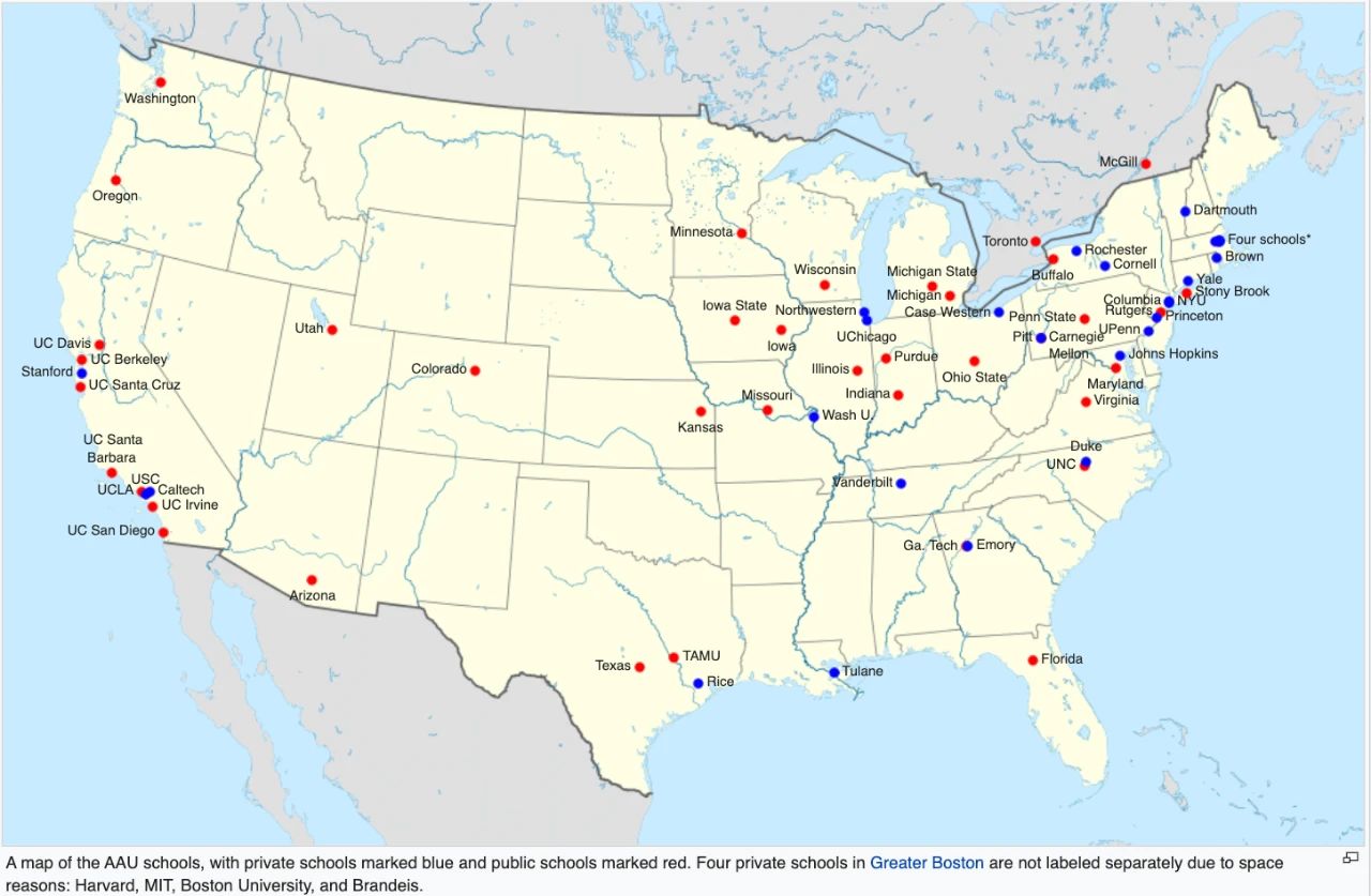 我们先看数字:截至2004年,AAU成员占美国大学研究经费的58%,以及美国授予的所有博士学位的52%。 自1999年以来,美国43%的诺贝尔奖获得者和74%的获奖者都隶属于AAU大学。 约有三分之二的美国艺术与科学学院2006级院士隶属于AAU大学。 AAU大学的学院包括美国国家科学院的2993名院士(占所有成员的82%):国家科学院,国家工程院和医学研究所。发放美国52%的博士学位,承担着67%的博士后的职位。