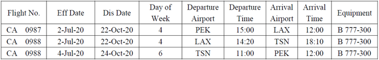 ②:根据民航局国际航班“奖励和熔断机制”,申请7/2-10/22期间北京-洛杉矶-天津-北京航线CA987/988航班每周第二班,每周四执行。