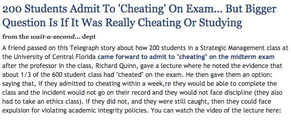 为了准备学校本科高年级一门管理策略课的期中考试,一个学生买到了这个教材的测试题库,一共有300道题目,并分享给了全班上课的200名同学。结果,教授在期中考试时,原封不动给了同样的300道考题。当然,这次考试学生分数都非常高。教授觉得事有蹊跷, 便将此事报告给了大学的学术委员会。法也责众,调查结束后,大学决定给全部200名学生一次违反学术诚信的警告。