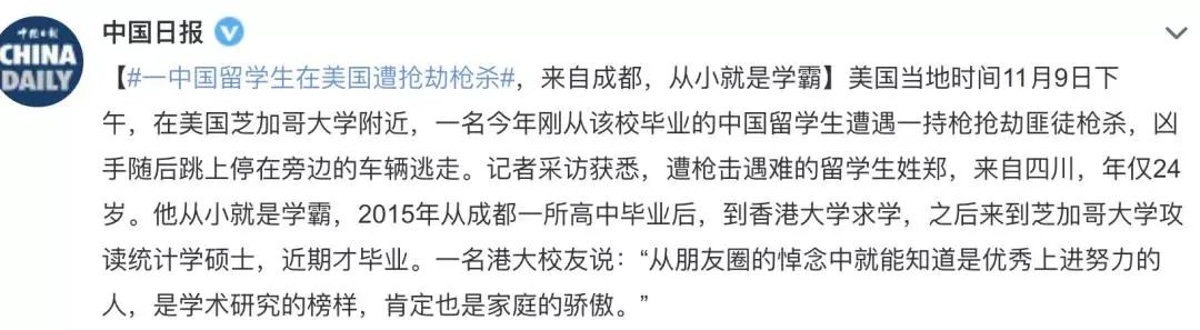 美国当地时间11月9日(周二)下午,芝加哥大学附近发生了一起恶性抢劫案件,一名刚毕业不久的中国留学生郑少雄(Shaoxiong Zheng)当街遭遇持枪抢劫,不幸中弹身亡,令人心痛!