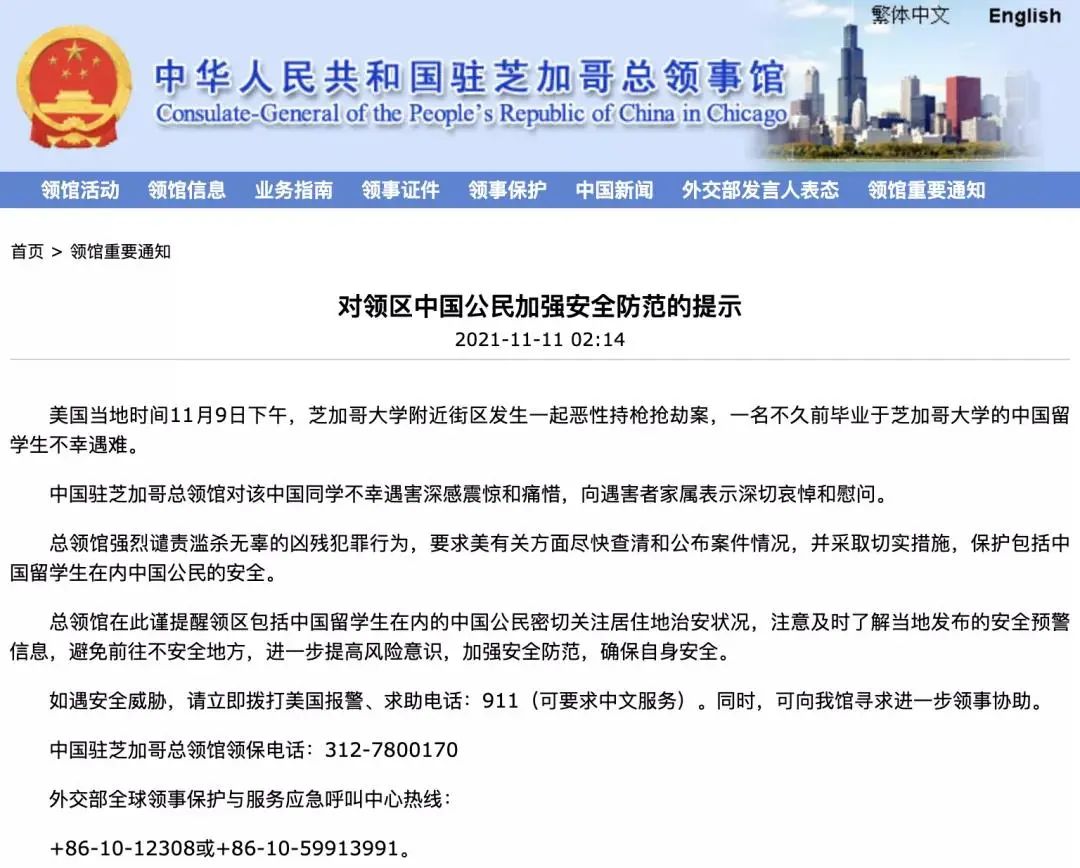而对于近日频繁发生的安全事件,驻芝加哥总领事馆提醒留学生注意安全: