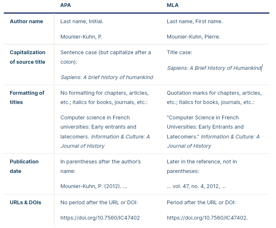 McCombes, S. (2022, August 23). APA vs. MLA | The Key Differences in Format & Citation. Scribbr. https://www.scribbr.com/citing-