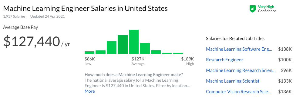 而作为AI领域最具潜力的方向之一,美国从事机器学习的从业者的平均年薪则为127,440美元,机器学习岗位是AI相关职位中薪资最高的,招聘的岗位也一直数量众多。
