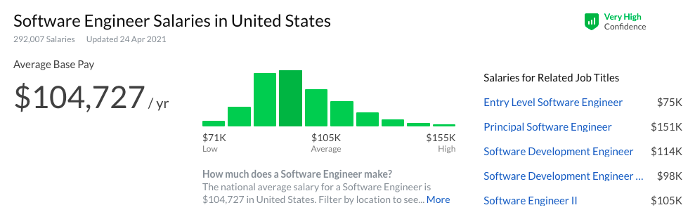 根据Glassdoor统计,截至2021年4月24日的数据,美国的软件工程师的全国平均薪资为104,727美元,而最高可达155+美元。