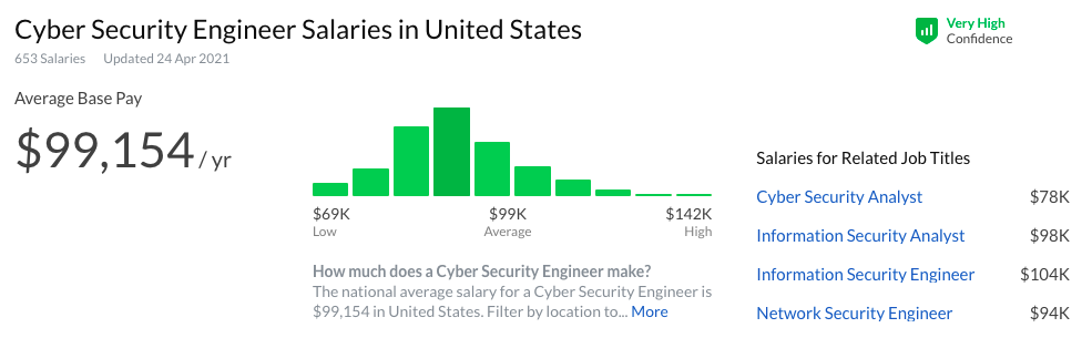 根据Glassdoor统计,截至2021年4月24日的数据,美国的网络安全工程师的全国平均薪资为99,154美元,而最高可达142K+美元。
