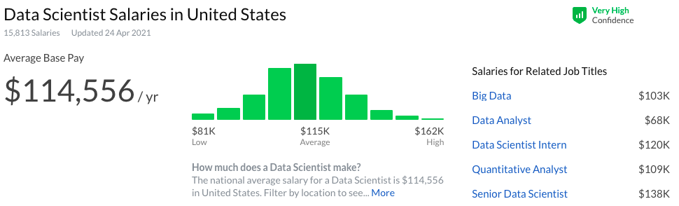 根据Glassdoor统计,截至2021年4月24日的数据,美国的数据科学家的全国平均薪资为114,556美元,而最高可达162K+美元。初级的Data Analyst数据分析师的薪资,则可达到68K美元/年。