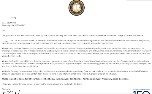 最后学生如愿以偿,上周收到了伯克利的录取,转学进入了加大伯克利分校。