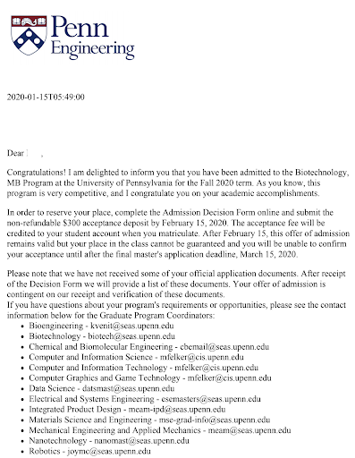 先说结果,这是宾大的录取,多年努力,今年一月初拿到了录取通知书!