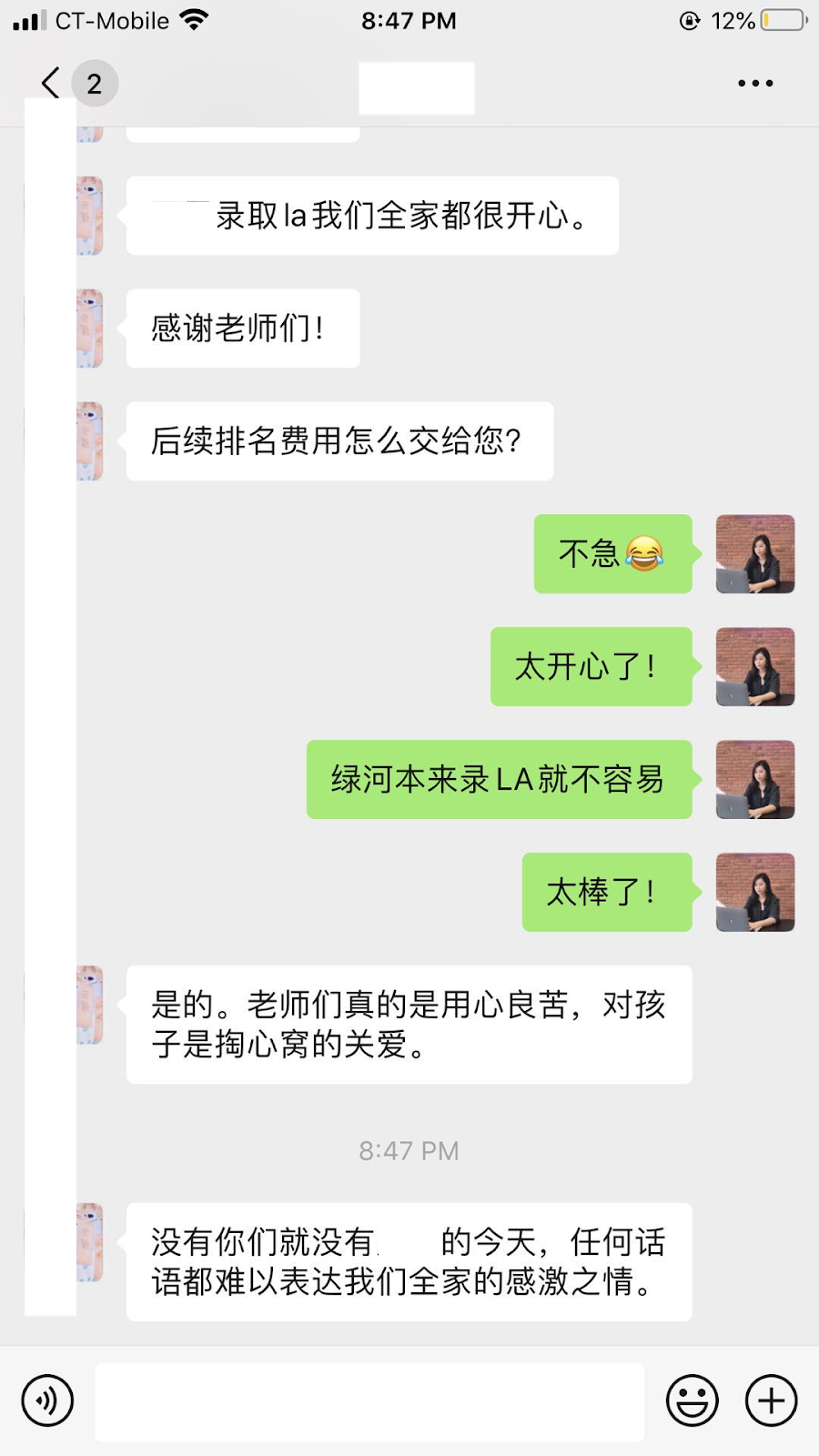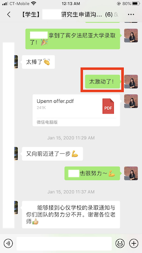 得到了梦校录取,家长和学生都非常高兴,国内一大早上起来,就开始感谢各位老师: