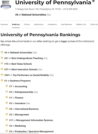 宾大是藤校,美国排名第6。