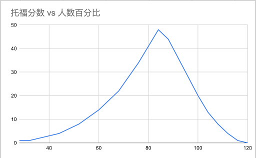 这是ETS官方发布的托福考试的分数分布曲线。 (原始数据网址:https://www.ets.org/s/toefl/pdf/94227_unlweb.pdf )