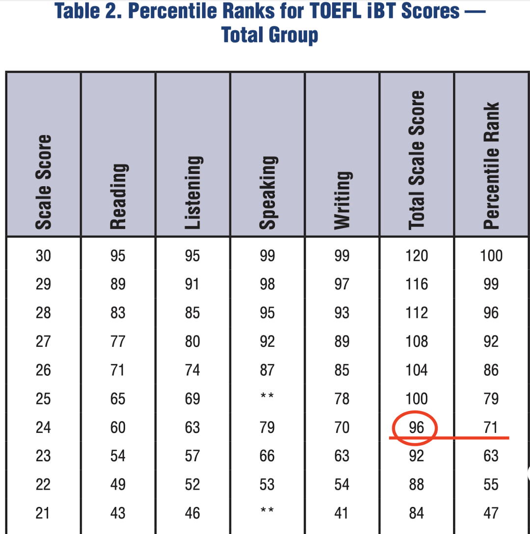 这是托福考试的分数分布。有71%的考生分数低于96分。