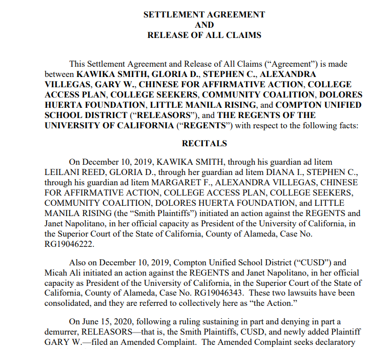 直到今年5月,加州大学选择与起诉方达成和解。根据和解协议,从2021年到2025年的招生都不将标化成绩作为录取参考,奖学金评选过程也不再对学生标化成绩进行审核。此外,如果2025年春季入学之后,加州大学如要恢复任何形式的“考试”,必须考虑公平性问题。不仅如此,加州大学在新的奖学金评选过程中也将停止对学生标化成绩的审核。