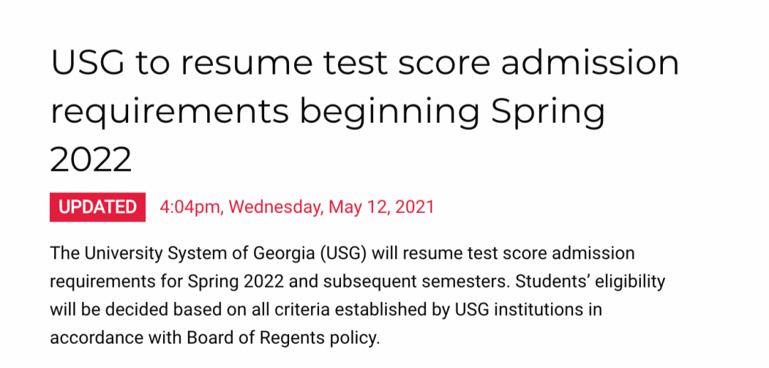 5月12日佐治亚州大学系统USG宣布,2022年春季及以后学期将恢复提交标化考试的要求。意味着佐治亚大学系统旗下26所公立学校都将恢复SAT/ACT成绩作为必要申请材料。目前,佐治亚理工、佐治亚大学已经做出回应,对于2022年春季及之后入学的学生,必须提交标化成绩,具体相关细则将于近日发布。