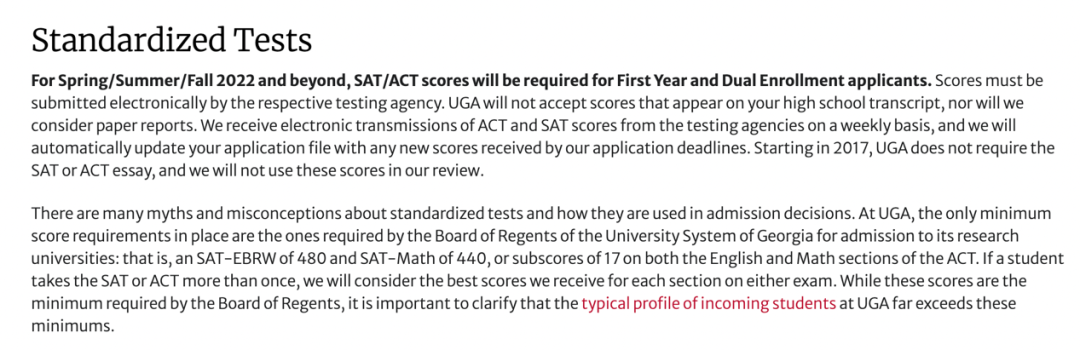 佐治亚大学官网显示,对于2022年春季及之后入学的学生,将恢复对新生和申请双学籍学习制度申请人的标化成绩考察。并明确提出只接受来自机构送分的标化成绩。