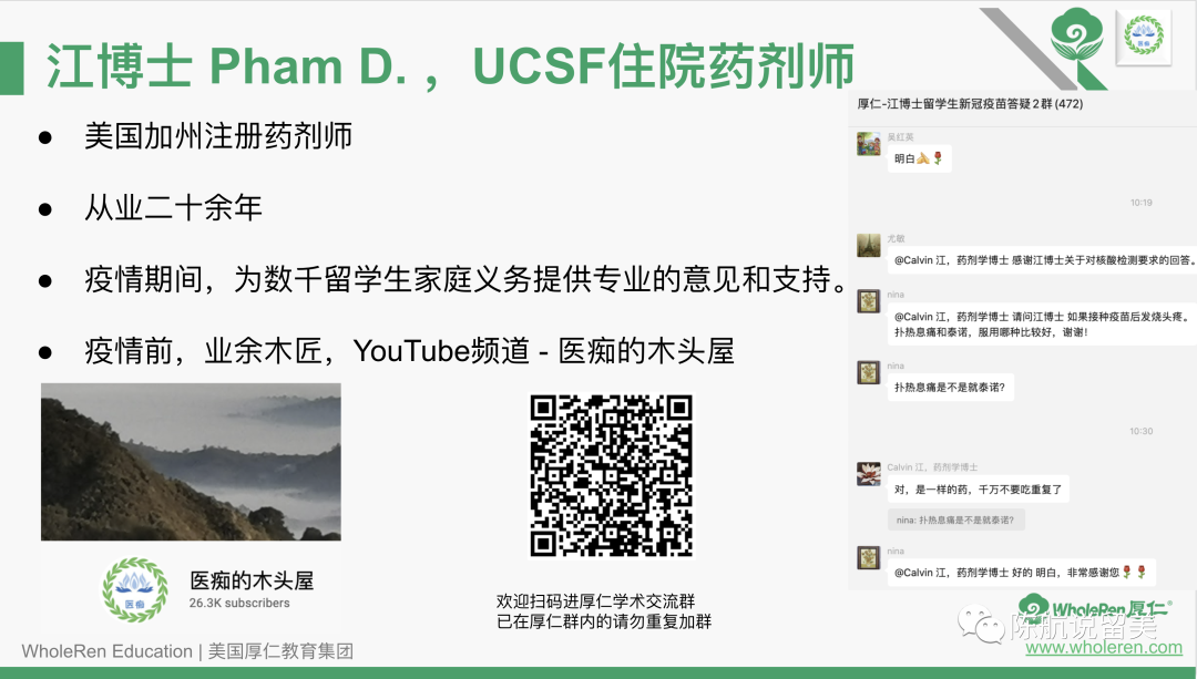 感谢各位家长同学观看周六的《疫苗疫情更新及安全返美注意事项》讲座,本次讲座的特邀主讲人 Calvin Jiang 江博士,是加大旧金山分校20多年的住院药剂师,具有非常丰富的药学领域经验。