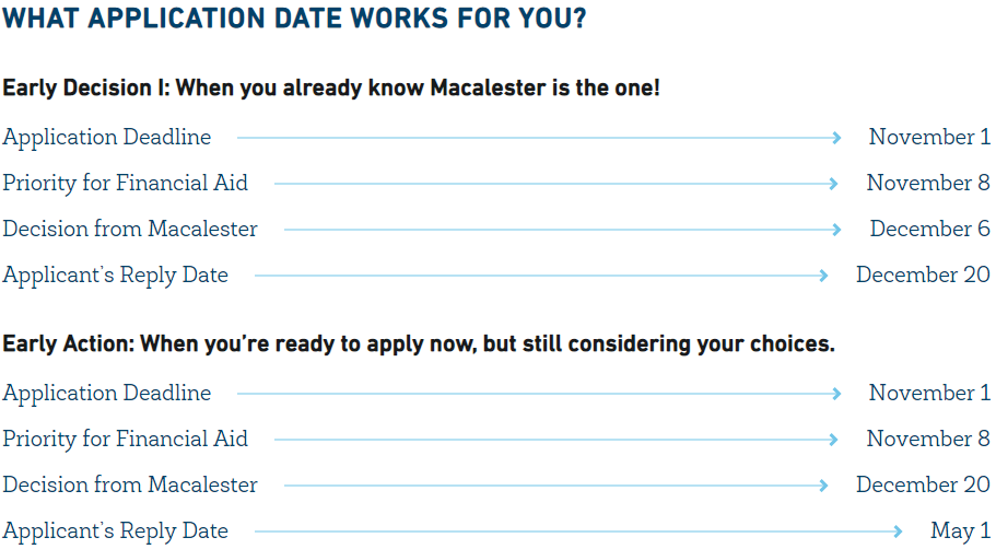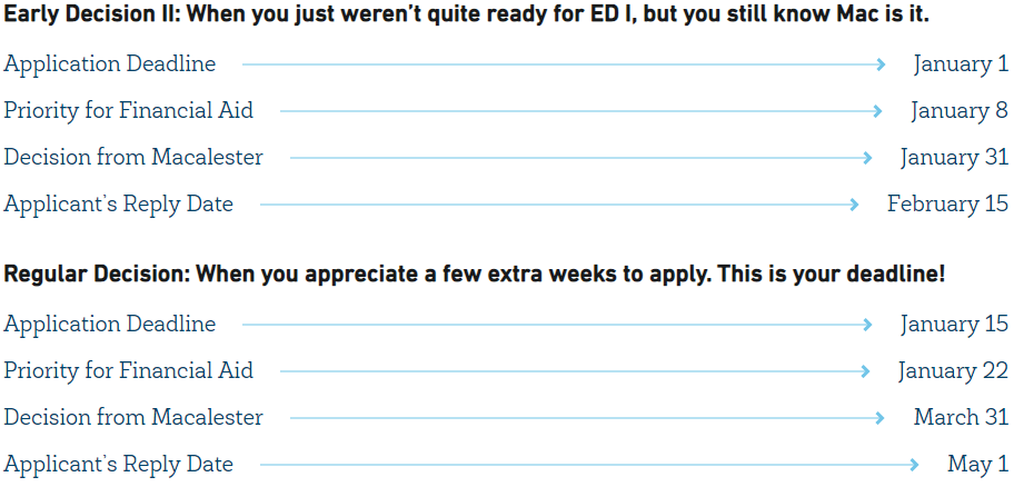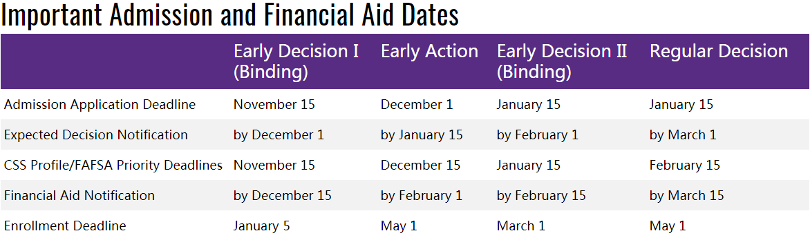 麦卡莱斯特学院是位于明尼苏达州圣保罗的一所私立文理学院,成立于1874年,是一所本科四年制大学。学校今年新增了EA申请,申请截止日期为11月1日,通知日期在12月20日。其他申请方式及相关日期如下: