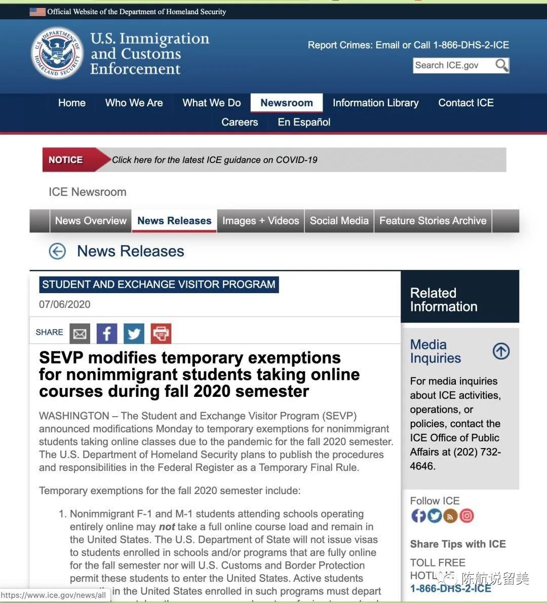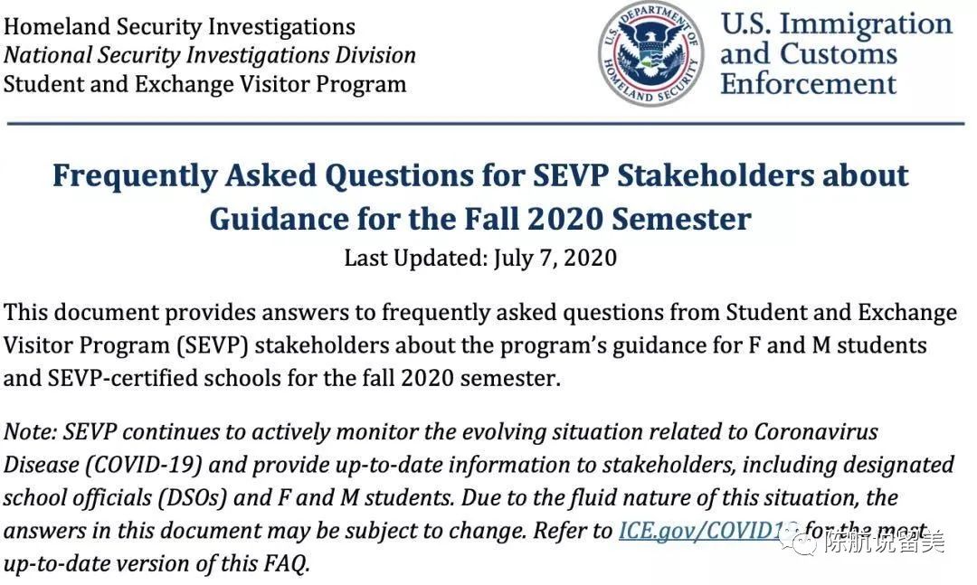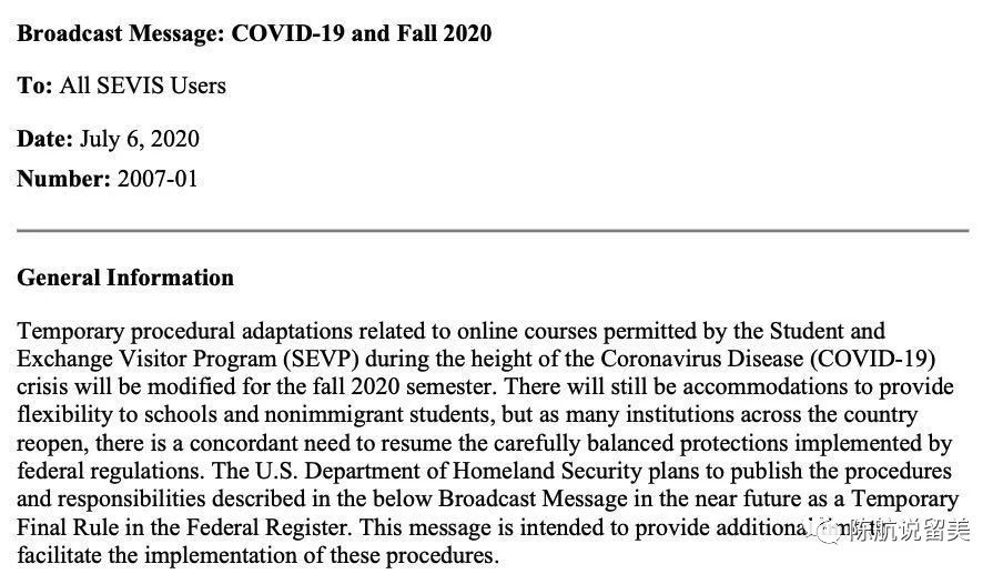 这个办公室管理着美国8000个学校的100万国际学生。通知内容为秋季学期非移民学生的线上课程调整。