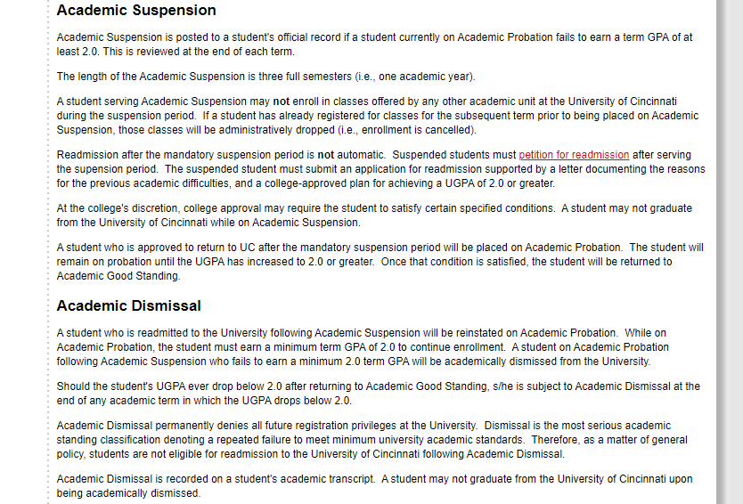 如果学生已经修课超过30学分,且UGPA低于2.0时,学生将会被留校察看(Academic Probation)。在留校察看期间,学生的学期GPA需要达到2.0以上,留校察看期直到学生的UGPA达到2.0以上后方可撤销。需要注意的是,留校察看的记录不会被记录在官方成绩单中,但是会被记录在学期成绩报告中,留校察看状态下的学生可能无法从UC毕业。