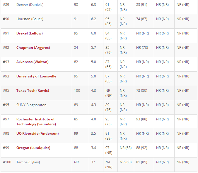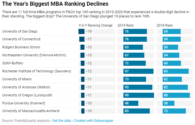 而在本次排名中,也有不少学校的排名出现了大幅下降的情况。其中,属圣地亚哥大学最惨,从去年的59名掉到了今年的76名,其他学校如下: