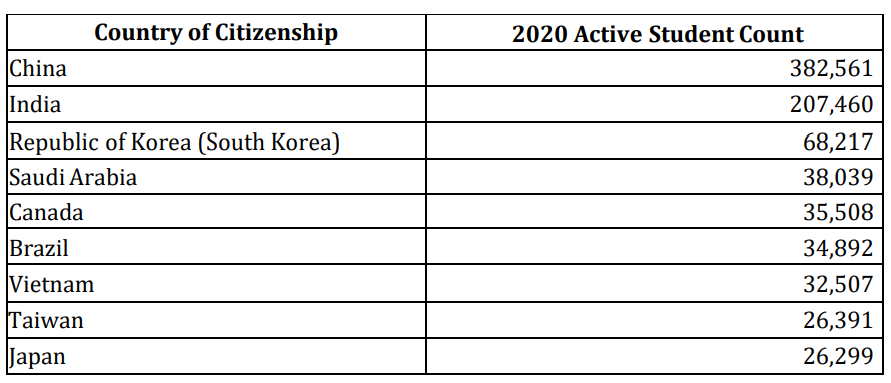 其中,中国赴美的留学生人数为382,561人,比2019年减少了91,926人。而且中国仍然是美国最大生源国。在赴美留学的国际生中,亚洲学生占到了大部分,其中中国和印度的留学生几乎是总留学生人数的一半,2020年赴美留学人数最多的十个国家和地区是: