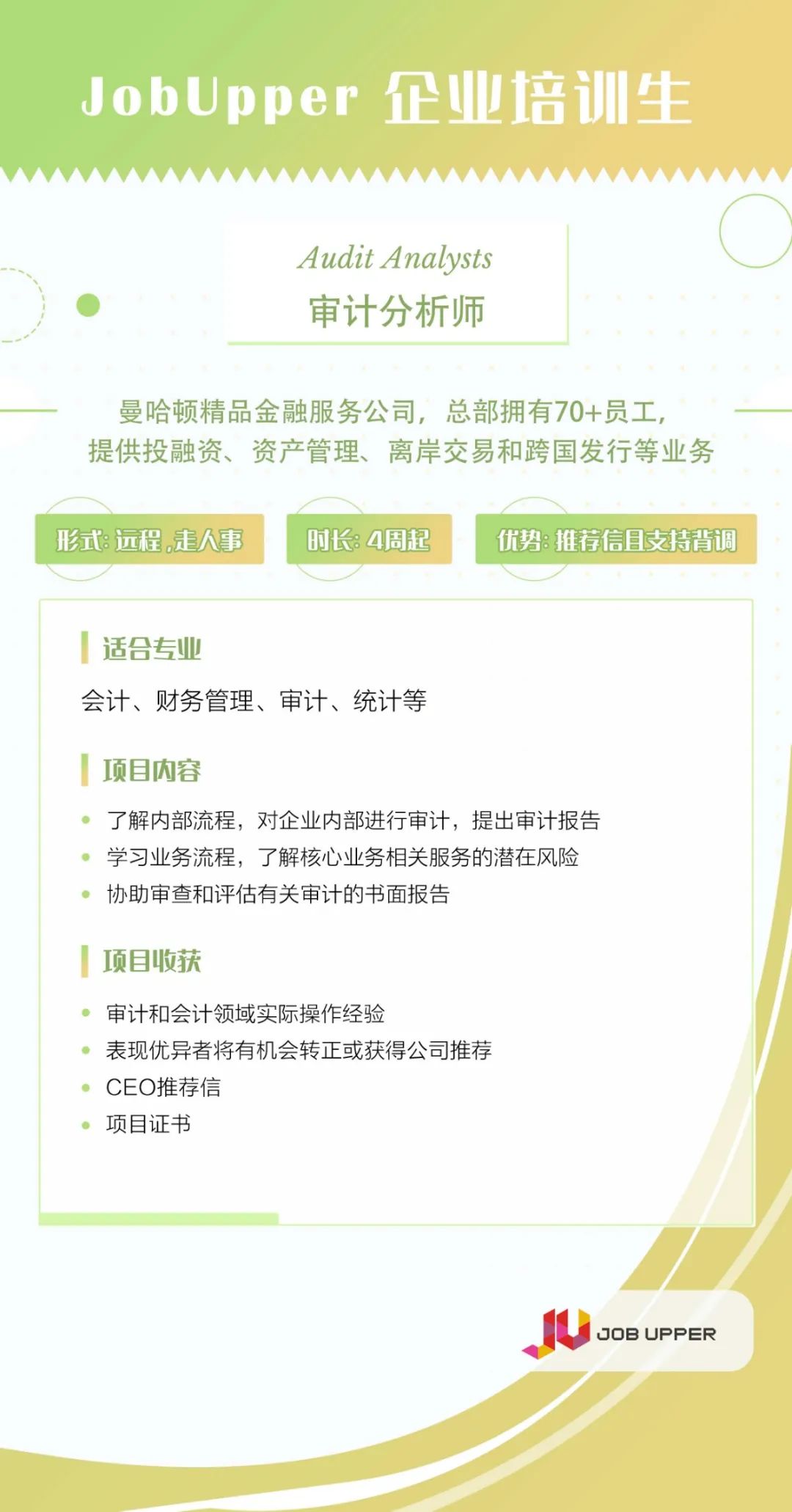 实习的数量不在多,而在专和精。时间不短于3个月,岗位最好能偏实际操作,有具体的业务是最好的。建议同学从转学初始就准备规划,并根据学业情况阶段性长期实施实习,实习的企业层级也要逐渐提升,下面小编为大家介绍几个非常适合在校生的几个实习: