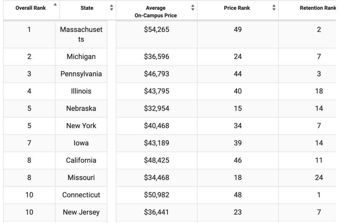 跟邻近的马萨诸塞州差不多,康涅狄格州的大学平均成本较高,为50,982美元,在全美排名第三。但康涅狄格州的学生保留率排名第一,师生比和六年毕业率也排名前十。