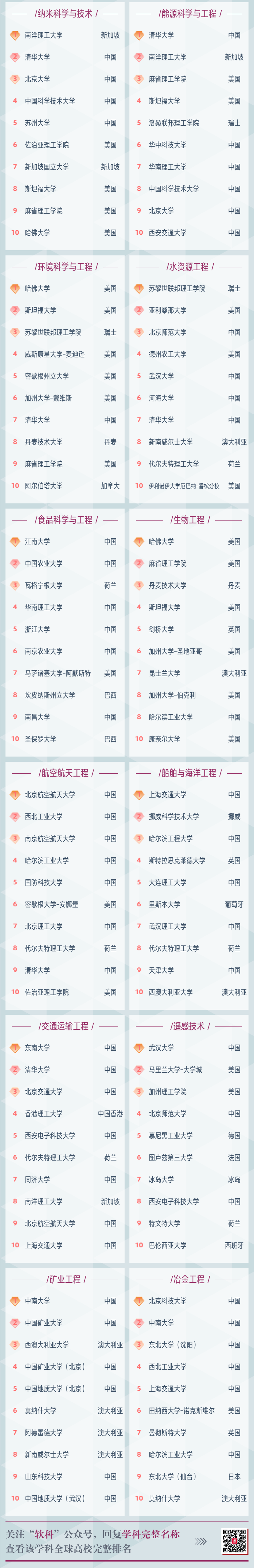 这是一份以理工科为主的大学学科排名,特别是对工科学科划分的比较细,很多在其他世界排名中找不到的工科学科排名,在这里可以找到。