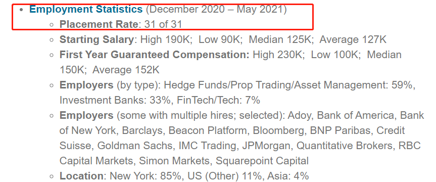 康奈尔的MFE项目位列第十,然而虽然位于TOP10,但是从数据中可以看出刚毕业的就业率仅为48%!3个月后,该项目的所有毕业生都找到了工作。(所以可能要做好“失业三个月”的准备,略显心酸!)